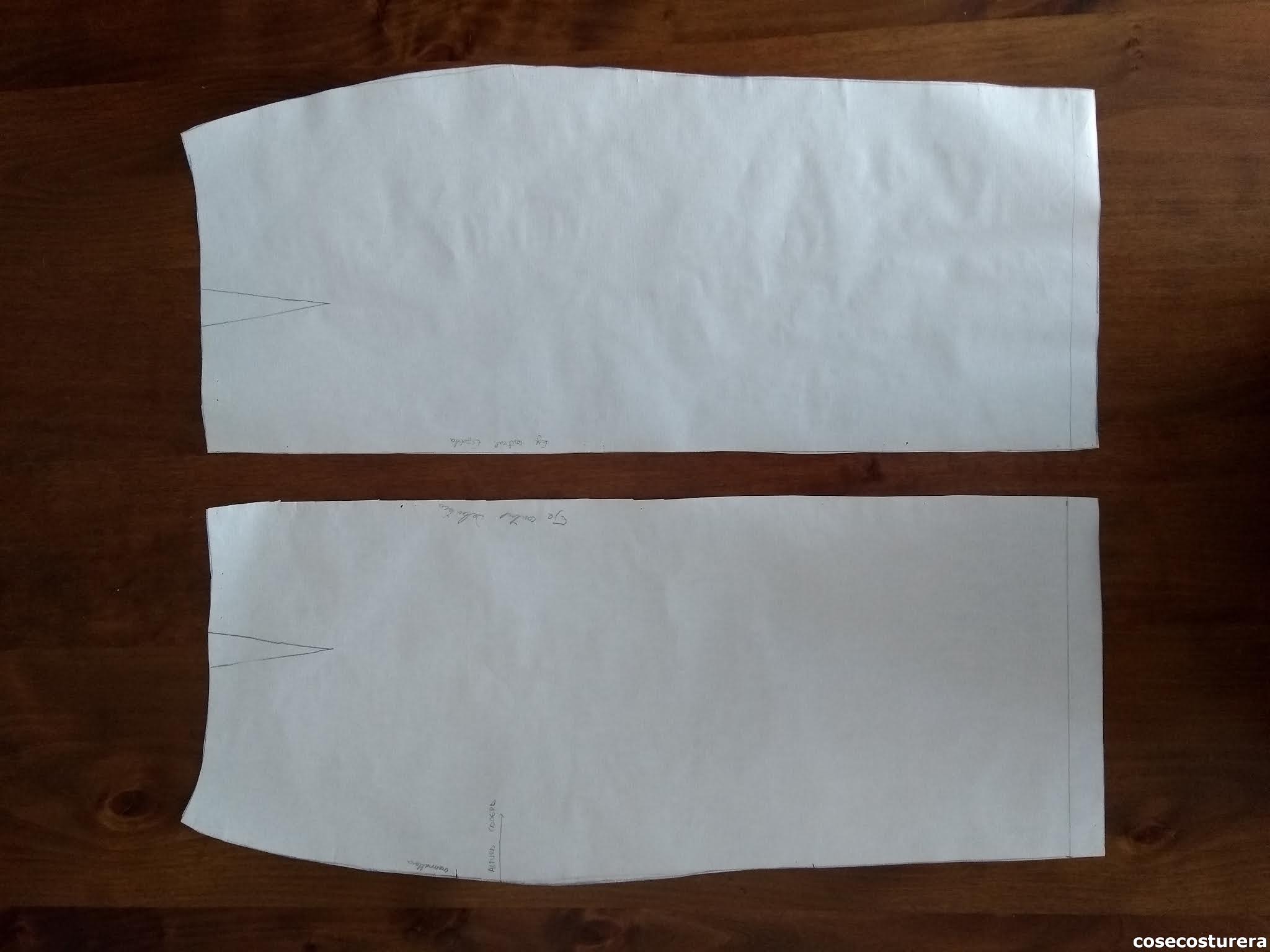 Después adaptaremos el patrón base a las medidas que hemos tomado y tendremos en cuenta que la falda lápiz es estrecha de abajo por lo que tendremos que ajustarlo también en el patrón.